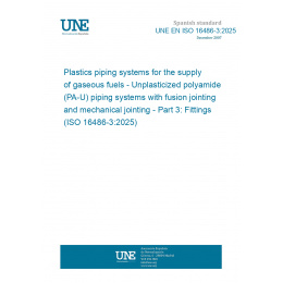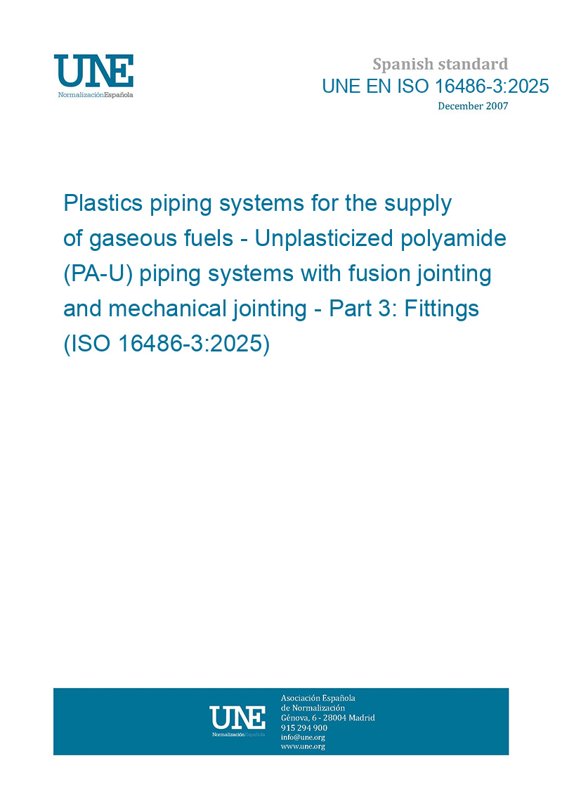 Sistemas de canalización en materiales plásticos para el suministro de combustibles gaseosos. Sistemas de canalización de poliamida no plastificada (PA-U) con unión por fusión y unión mecánica. Parte 3: Accesorios. (ISO 16486-3:2025).