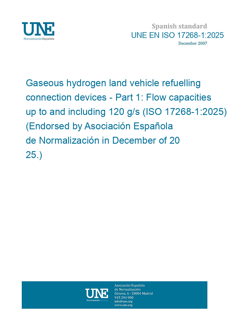 Dispositivos de conexión para el suministro de hidrógeno gaseoso a los vehículos terrestres. Parte 1: Capacidades de flujo hasta 120 g/s inclusive (ISO 17268-1:2025) (Ratificada por la Asociación Española de Normalización en diciembre de 2025.)