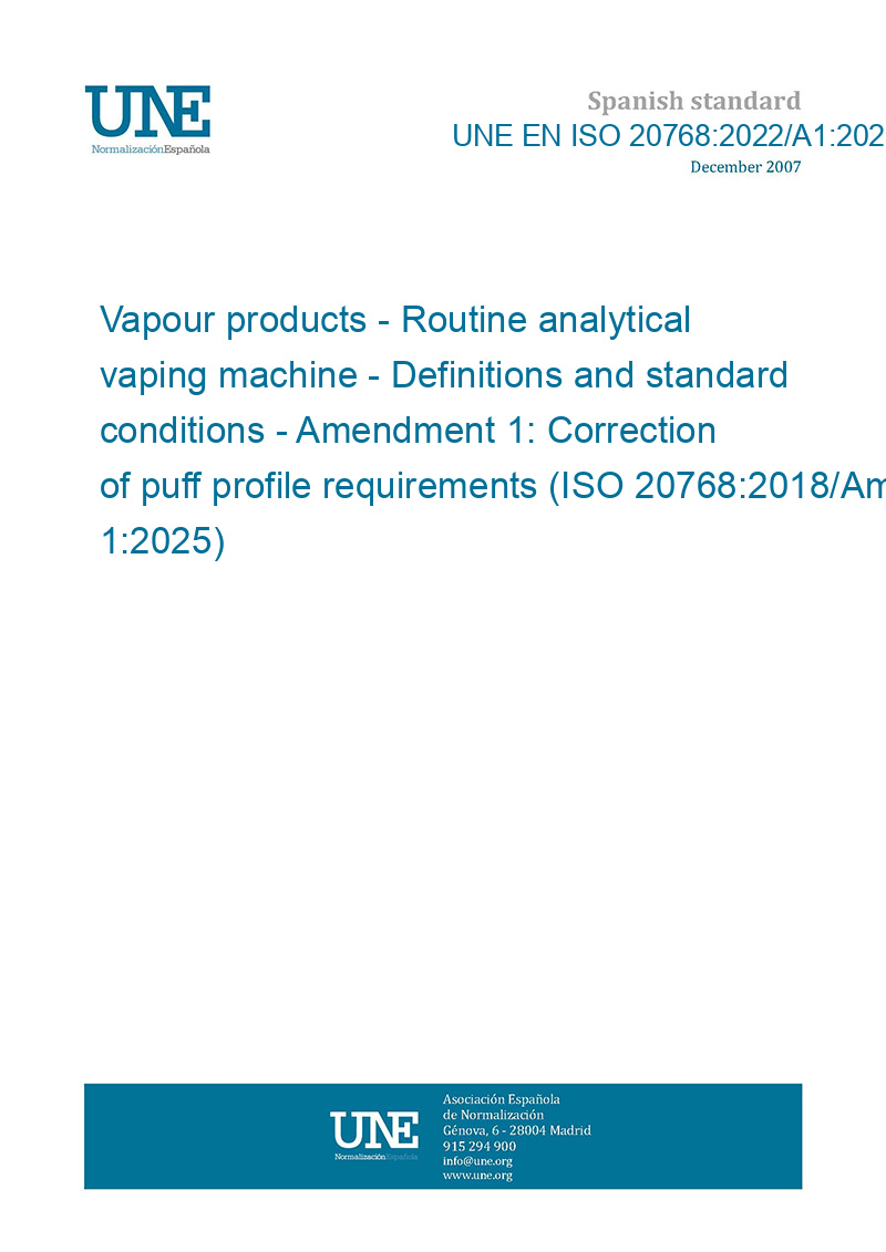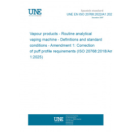 Productos de vapeo. Máquina de vapear para análisis de rutina. Definiciones y condiciones normalizadas. Modificación 1: Corrección de los requisitos del perfil de succión. (ISO 20768:2018/Amd 1:2025).