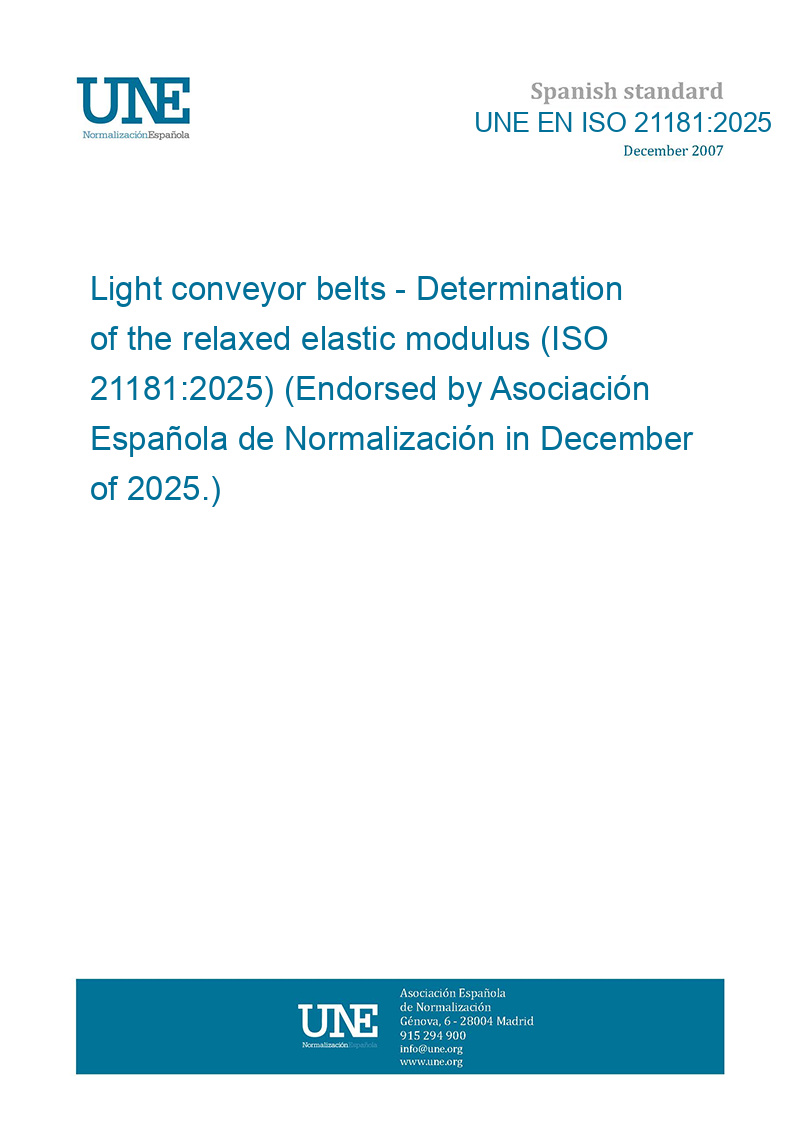 This standard UNE EN ISO 21181:2025 Light conveyor belts - Determination of the relaxed elastic modulus (ISO 21181:2025) (Endorsed by Asociación Española de Normalización in December of 2025.) is classified in these ICS categories: