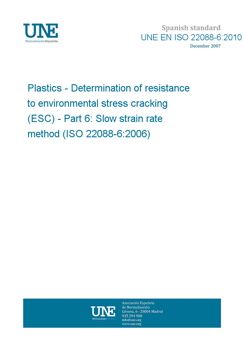Plásticos. Determinación de la resistencia a la fisuración bajo esfuerzo en un medio ambiente activo (ESC). Parte 6: Método con velocidad de deformación lenta. (ISO 22088-6:2006).