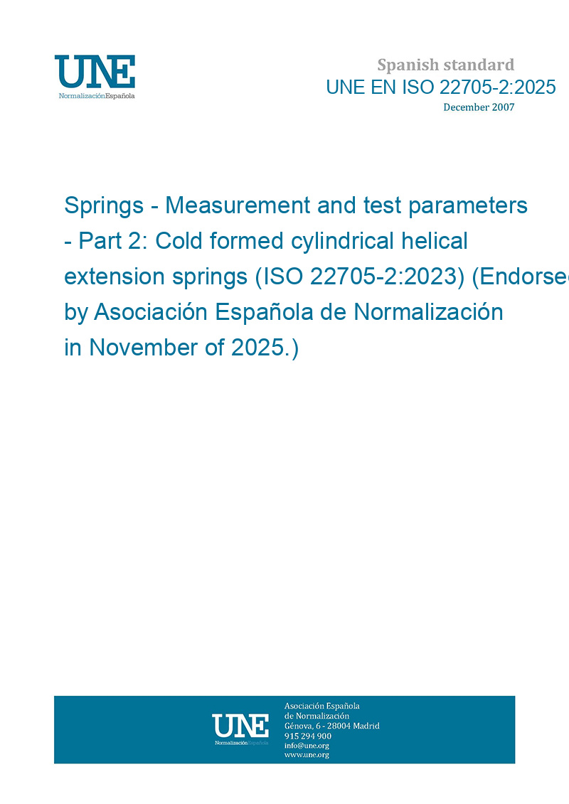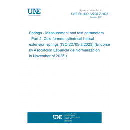 Muelles. Parámetros de medición y ensayo. Parte 2: Muelles helicoidales de extensión cilíndricos conformados en frío (ISO 22705-2:2023) (Ratificada por la Asociación Española de Normalización en noviembre de 2025.)