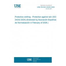 This standard UNE EN ISO 24232:2025 Protective clothing - Protection against rain (ISO 24232:2024) (Endorsed by Asociación Española de Normalización in February of 2026.) is classified in these ICS categories: