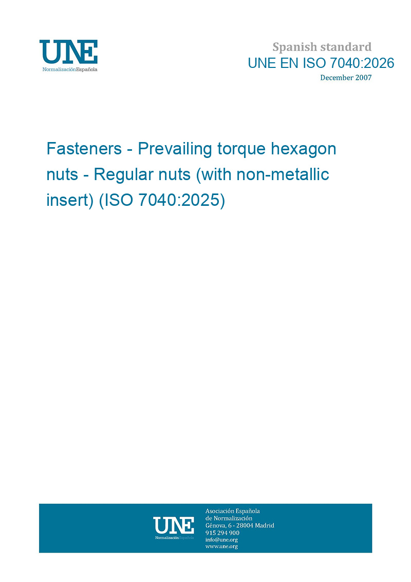 This standard UNE EN ISO 7040:2026 Fasteners - Prevailing torque hexagon nuts - Regular nuts (with non-metallic insert) (ISO 7040:2025) is classified in these ICS categories: