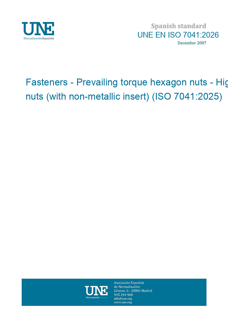 This standard UNE EN ISO 7041:2026 Fasteners - Prevailing torque hexagon nuts - High nuts (with non-metallic insert) (ISO 7041:2025) is classified in these ICS categories: