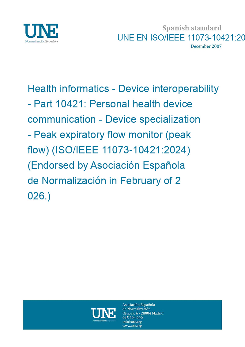 This standard UNE EN ISO/IEEE 11073-10421:2026 Health informatics - Device interoperability - Part 10421: Personal health device communication - Device specialization - Peak expiratory flow monitor (peak flow) (ISO/IEEE 11073-10421:2024) (Endorsed by Asociación Española de Normalización in February of 2026.) is classified in these ICS categories: