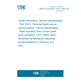 Health informatics - Device interoperability - Part 10421: Personal health device communication - Device specialization - Peak expiratory flow monitor (peak flow) (ISO/IEEE 11073-10421:2024) (Endorsed by Asociación Española de Normalización in February of 2026.)