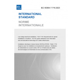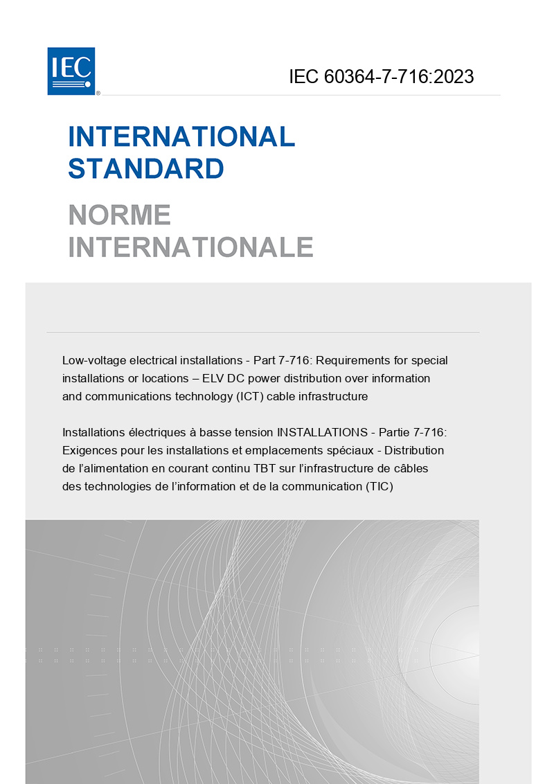 IEC 60364-7-716:2023 specifies requirements in electrical installations for the distribution of ELV DC power using balanced, information technology cables and accessories primarily designed for data transmission, as specified in terms of a category within the channels of ISO/IEC 11801-1 using power sourcing equipment in accordance with IEC 62368-3.