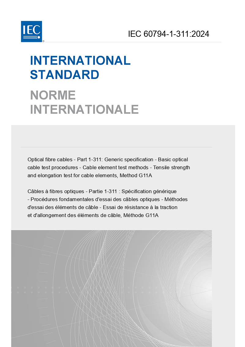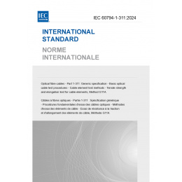 IEC 60794-1-311:2024 describes test procedures to be used in establishing uniform requirements of optical fibre cable elements for the mechanical property – tensile strength and elongation at break. This document applies to optical fibre cables for use with telecommunication equipment and devices employing similar techniques, and to cables having a combination of both optical fibres and electrical conductors. Throughout the document, the wording "optical cable" can also include optical fibre units, microduct fibre units, etc.