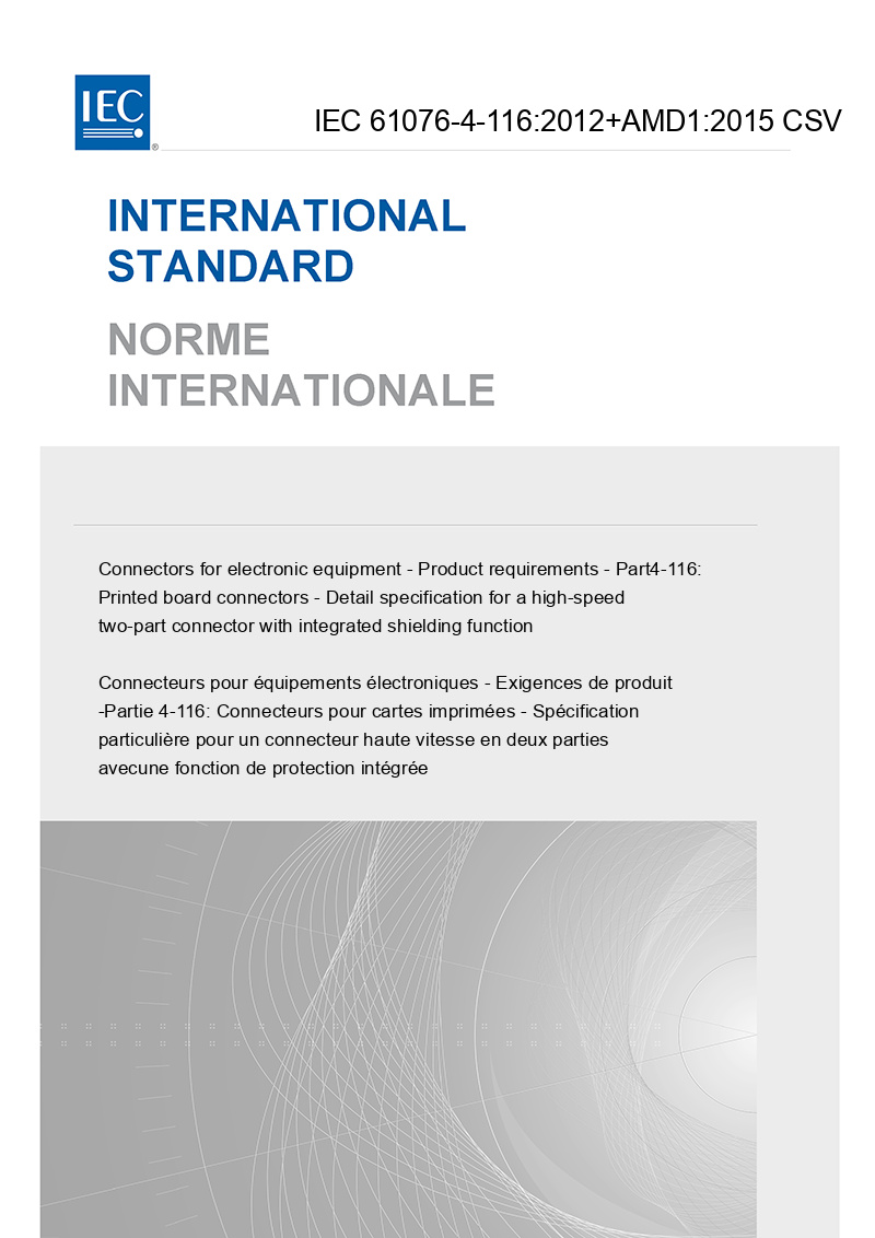 IEC 61076-4-116:2012+A1:2015 establishes specifications and test requirements for a high-speed two-part connector with integrated shielding function for use as a printed board connector in industrial environments. The connectors connect a backplane to printed boards. Keywords: Connector, Printed board connector. This consolidated version consists of the first edition (2012) and its amendment 1 (2015). Therefore, no need to order amendment in addition to this publication.