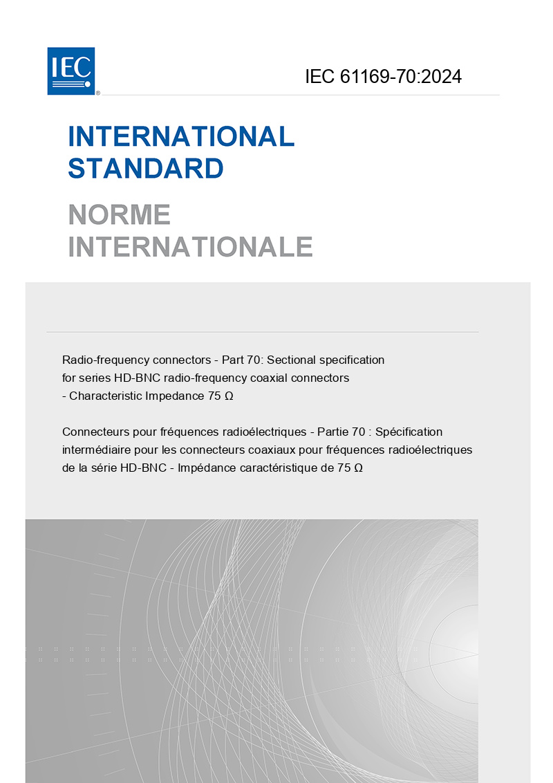 IEC 61169-70:2024, which is a sectional specification (SS), provides information and rules for the preparation of detail specifications (DS) of HD-BNC series RF coaxial connectors together with the pro forma blank detail specification. HD-BNC series connectors with characteristic impedance of 75 Ω are used with RF cables or micro-strips in microwave, telecommunication, wireless and other fields. The operating frequency limit is up to 18 GHz.