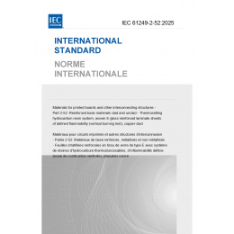 IEC 61249-2-52:2025 gives requirements for properties of the thermosetting hydrocarbon resin system, woven E-glass reinforced laminate sheets of defined flammability (vertical burning test), copper-clad in thicknesses of 0,05 mm up to 3,20 mm.