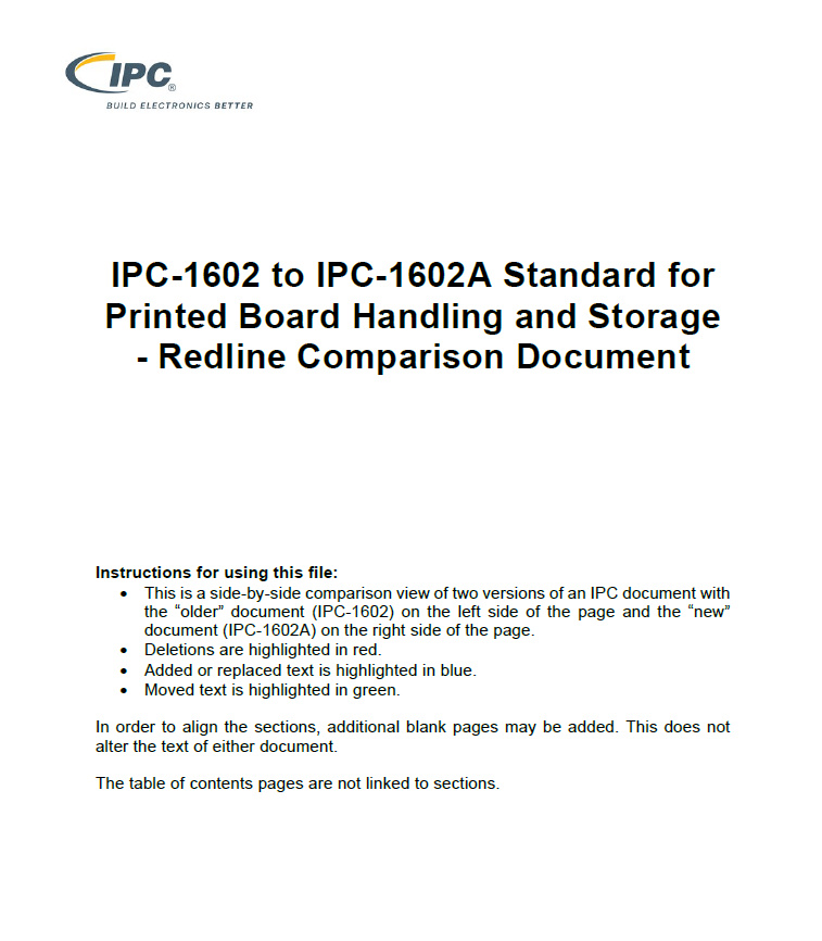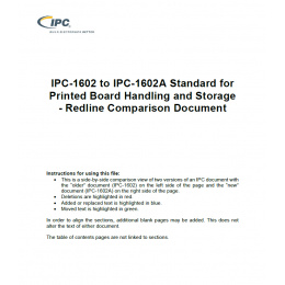 IPC-1602A Redline document shows the changes from IPC-1602 to IPC-1602 - Revision A in a side-by-side comparison of the two documents. This is only available in digital format.