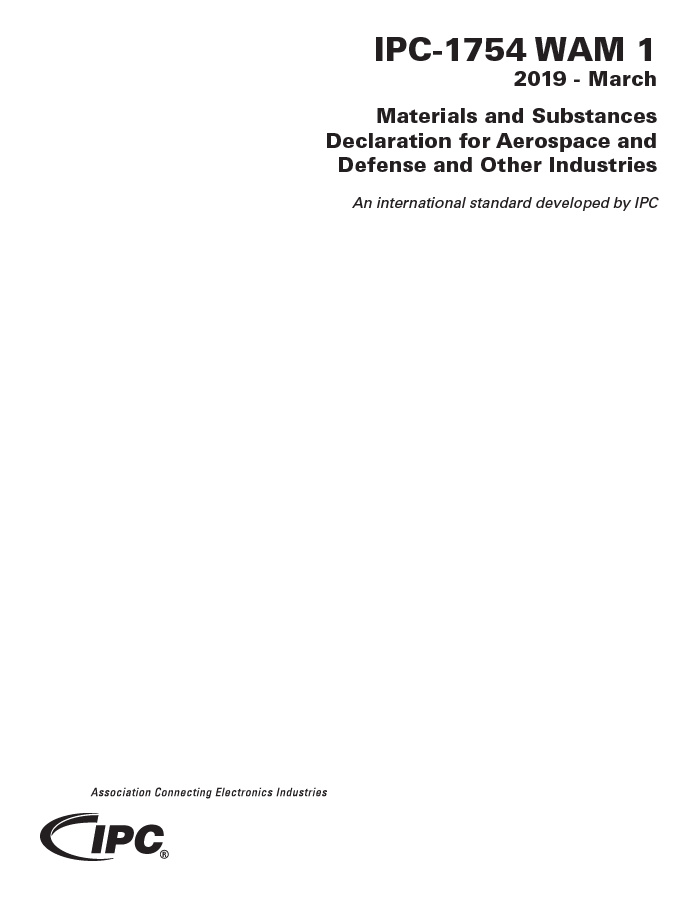 IPC-1754 WAM 1 Materials and Substances Declaration for Aerospace and Defense and Other Industries establishes the requirements for exchanging material and substance data for products between suppliers and their customers for Aerospace and Defense, Heavy Equipment and other industries.
