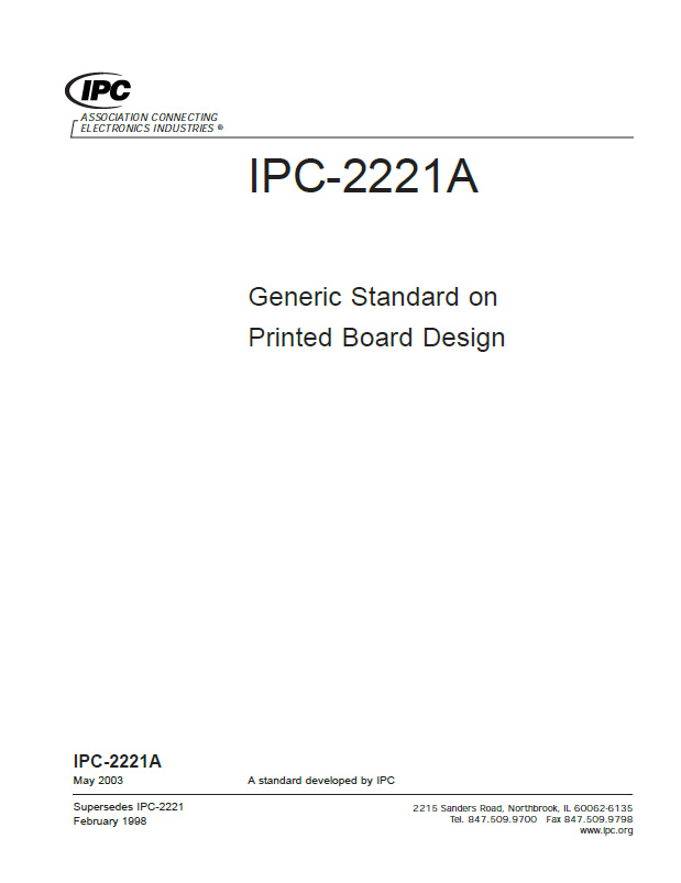IPC-2221A is the foundation design standard for all documents in the IPC-2220 series. It establishes the generic requirements for the design of printed boards and other forms of component mounting or interconnecting structures, whether single-sided, double-sided or multilayer. Among the many updates to Revision A are new criteria for surface plating, internal and external foil thicknesses, component placement and hole tolerances. Expanded coverage is provided for material properties, dimensioning and tolerancing rules, and via structures as well as updated coupon designs for quality assurance. 112 pages. Released May 2003.