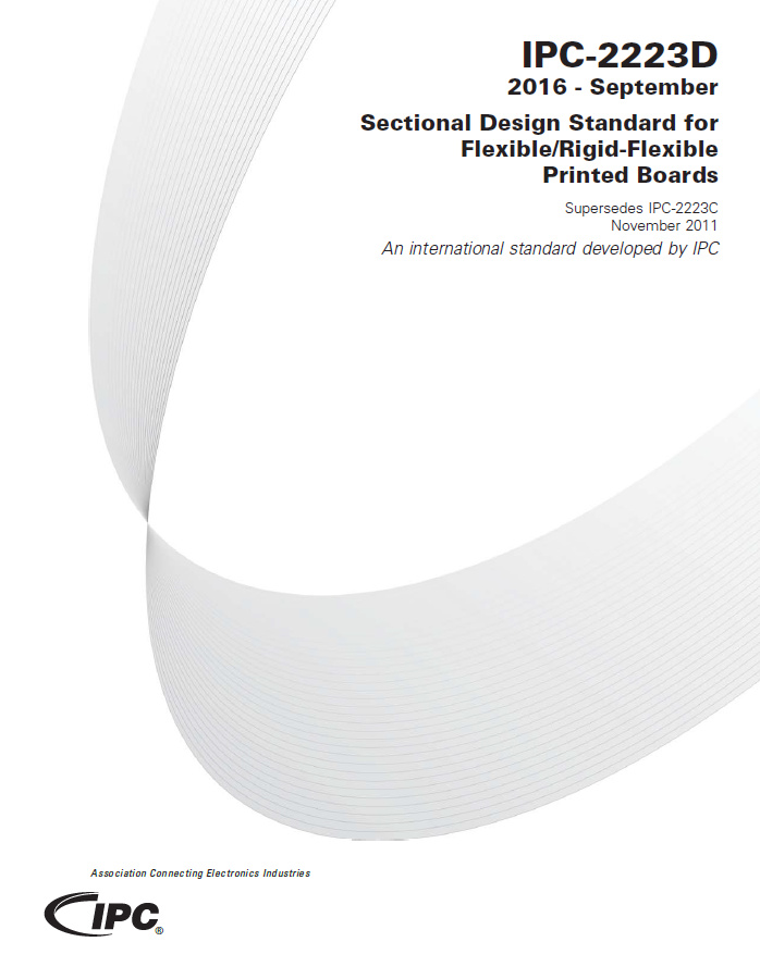 Used in conjunction with IPC-2221, IPC-2223 establishes the specific requirements for the design of flexible printed boards and forms of component mounting and interconnecting structures. The flexible materials used in the structures are comprised of insulating films, reinforced and/or non-reinforced dielectric in combination with metallic materials. Revision D provides new design guidance and requirements for material selection and construction, selective (button) plating, minimum bending for flexible circuits with coverlay, impedance and capacitance control, unsupported edge conductors/fingers and copper filled vias/microvias.
