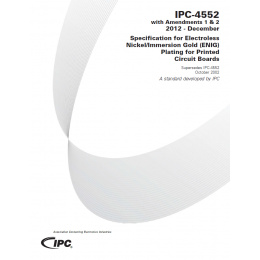 In answer to numerous industry requests for guidance on electroless nickel/immersion gold (ENIG), IPC-4552 was developed. Containing full color photographs, this specification sets the requirements for the use of ENIG as a surface finish for printed boards. It includes requirements for ENIG deposit thicknesses based on performance criteria. It is an invaluable resource for use by suppliers, board fabricators, electronics manufacturing service (EMS) providers and original equipment manufacturers (OEMs). The specification's Appendix also includes a FREE copy of the highly sought-after technical paper, “Standard Developments Efforts of Electroless Nickel Immersion Gold,” by George Milad and Gerard O’Brien. The ENIG board surface finish is an electroless nickel layer capped with a thin layer of immersion gold. The immersion gold protects the underlying nickel from oxidation or passivation over its intended life. It is a multifunctional surface finish, applicable to soldering, aluminum wire bonding, press fit connections, and as a contact surface. The addition of Amendments 1 & 2 to this document provides for the use of thinner immersion gold, down to 0.04 microns (1.58 microinches), than was previously allowed at 0.05 microns (1.97 microinches). However, such thinner gold can only be utilized when the electrical connection is to be made via soldering. Also, the rules by which rework and/or repair of a printed board's ENIG surface finish are now defined. 33 pages. Released December 2012.
