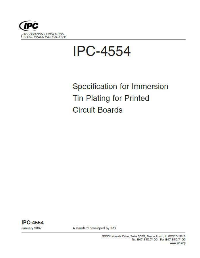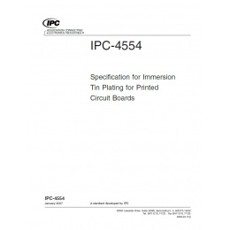 IPC-4554, Specification for Immersion Tin Plating for Printed Circuit Boards, is included in the IPC-455X series of specifications that set the requirements for printed board surface finishes that are alternates to non-coplanar finishes, most often referred to as tin-lead HASL finish. This specification is a full-color document that is intended for use by the supplier or printed board fabricator, plating chemistry supplier, contract assembler or EMS facility and the original equipment manufacturer (OEM). The immersion tin (Sn) is a metallic finish deposited by a chemical displacement reaction that is applied directly to the basis metal of the printed board, which is copper. The immersion tin is primarily used as a solderable surface for attachment of components. It may also be used when press fit connections are employed and for zero insertion force (ZIF) edge connectors. The immersion tin finish protects the underlying copper from oxidation over the intended shelf life of this finish that is described in IPC/EIA J-STD-003 as a Category 3 coating durability finish (storage of greater than six months).
