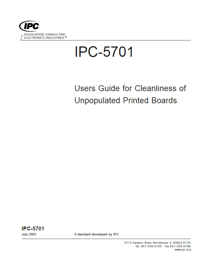 Tackling PCB cleanliness is a tough job; residues on printed circuit boards are directly related to the reliability of the produced hardware and can result in serious failures if not known or monitored. But how do you measure "cleanliness"? How clean is "clean"? The IPC-5701 provides guidance into how these issues should be approached and specified in purchasing documents, addressing levels of cleanliness, how to specify them, common locations for testing, and information on sample sizes. 6 pages. Released July 2003.