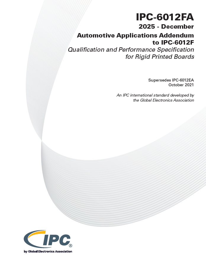 The IPC-6012FA Addendum, when required by procurement documentation/drawings, supplements or replaces specifically identified requirements of IPC-6012 revision F, for rigid printed boards that must survive the vibration and thermal cycling environments of electronic interconnects within the automotive industry.