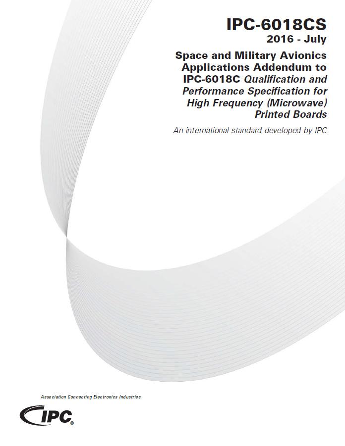 This Addendum supplements or replaces specifically identified requirements of IPC-6018C, for high frequency (microwave) printed boards that must survive the vibration, ground testing and thermal cyclic environments of space and military avionics.