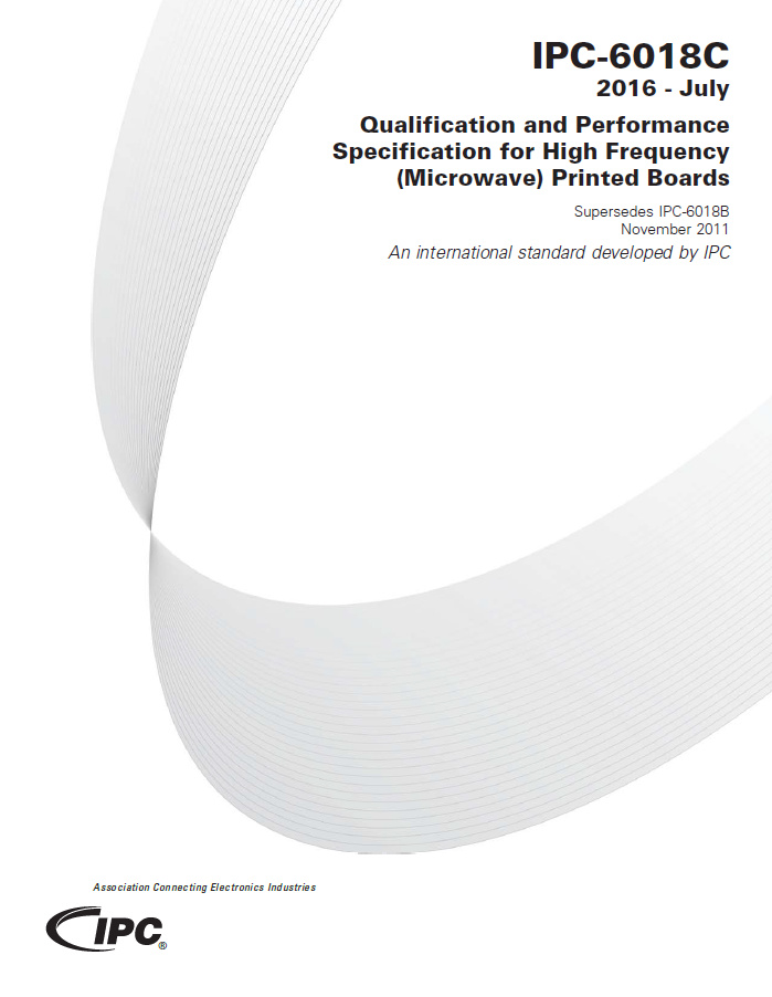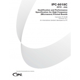 This specification covers qualification and performance of high frequency (microwave) boards, including single-sided, double-sided, with or without plated-through holes, multilayer with or without blind/buried vias and metal core boards. It addresses final finish and surface plating coating requirements, conductors, holes/vias, frequency of acceptance testing and quality conformance as well as electrical, mechanical and environmental requirements. Revision C incorporates many new requirements in areas such as HASL coatings, alternative surface finishes, edge plating, marking, microvia capture and target lands, copper cap plating of filled holes, copper filled microvias, PTFE smear and dielectric removal. For use with IPC-6011. Supersedes IPC-6018B and IPC-6016.