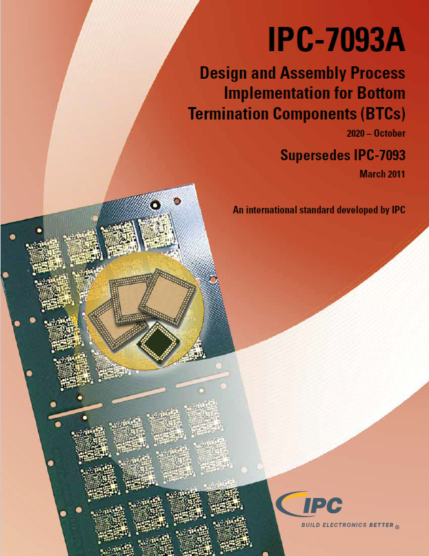 The IPC-7093A standard provides essential design and assembly guidance for implementing bottom termination components (BTCs). Specifically, IPC-7093A provides guidelines on critical design, materials, assembly, inspection, repair, quality, and reliability issues associated with BTCs.