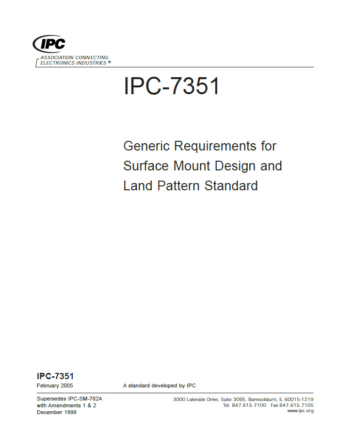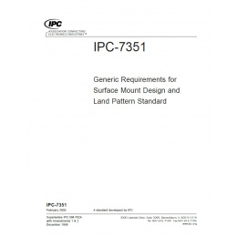 The successor to the IPC-SM-782A is here! The document covers land pattern design for all types of passive and active components, including resistors, capacitors, MELFs, SSOPs, TSSOPs, QFPs, BGAs, QFNs and SONs. The standard provides many brand new features, including an intelligent land pattern naming convention, zero component rotations for CAD systems, and a set of three separate land pattern geometries for each component that allows the user to select a land pattern based on desired component density. Also includes updates to existing sections addressing land pattern guidelines for wave or reflow soldering, via location guidelines, fiducials and courtyard boundaries. IPC-7351 includes both the standard and a IPC-7351 land pattern viewer on CD-ROM. 92 Pages. Released February 2005.