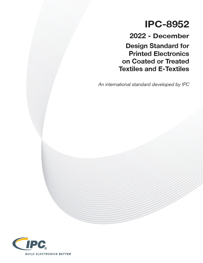 IPC-8952 standard establishes specific requirements for the design of printed electronic applications and their forms of component mounting and interconnecting structures on coated or treated textile substrates. Textile substrate, as pertains to IPC-8952 standard, could be a bare textile or an integrated e-textile (e.g., woven or knitted e-textile). Coated or treated textile substrates, as pertain to IPC-8952 standard, are textile substrates which have or will have a coating or treatment localized or across the full substrate.
