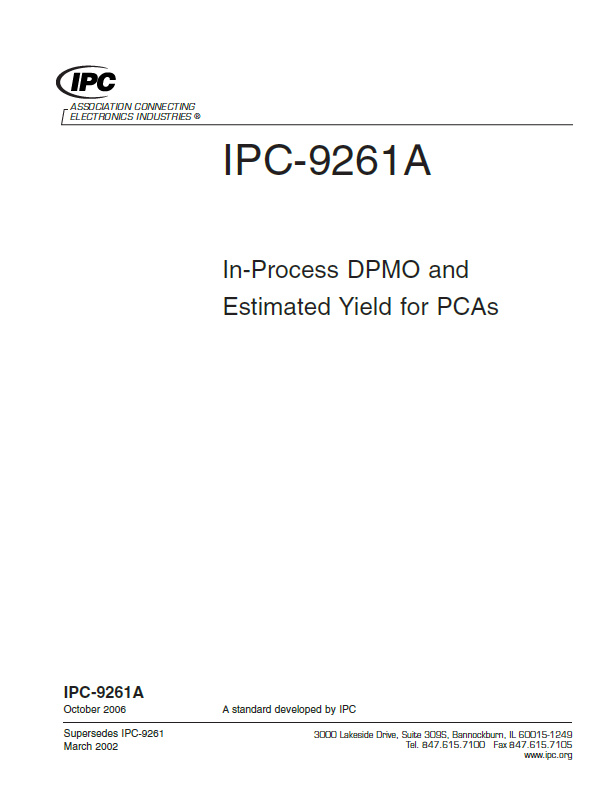 Now updated to align with IPC-7912A for end item DPMO, this document defines consistent methodologies for computation of in-process defects per million opportunities (DPMO) metrics for any evaluation stage in the assembly process. It is intended for use in measuring in-process assembly steps rather than end product determination. Calculation of completed item DPMO is addressed in IPC-7912A. A guide to defect categorization is provided that can serve as a base for summarizing and reporting in-process defects when used with J-STD-001 and IPC-A-610. It can also be used to develop process step estimated yield - the expected percentage of assemblies with no defects for a particular process step or combined process steps, based on historical defect rates.
