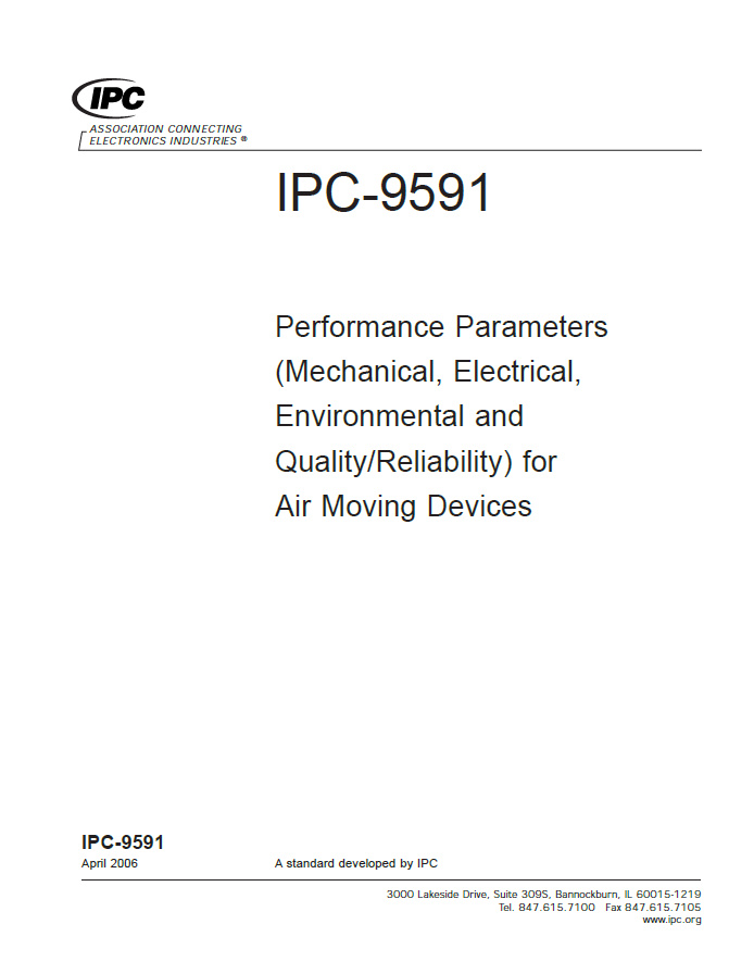 This document standardizes the performance parameters for air moving devices. The phrase "air moving device" (or "air mover") refers to equipment such as, fans, blowers and other forced air movement technologies. These air moving devices are used in the electronics industry for the cooling of heat-producing components, and range from small devices mounted directly to hot components such as microprocessor air moving devices, to larger devices used to force air through a chassis containing many heat dissipating components. This specification sets requirements for design, manufacture, and test application of air moving devices. The term "end user" as used in this document refers to the OEM or design/materials entity responsible for specifying the function and reliability of an air moving device in a final product application. 19 pages. Released April 2006.