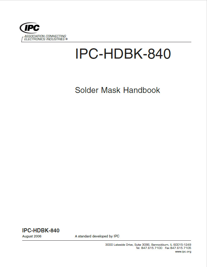 IPC-HDBK-840 supplements the solder mask requirements established in IPC specifications such as IPC-SM-840 and IPC-6012 by providing detailed information on solder mask types, application processes, pre- and post- assembly processes, characteristics and properties that are useful in the selection and use of the most appropriate mask type for a given application. Applicable to solder mask manufacturers, processing equipment manufacturers, PCB manufacturers, assembly manufacturers and ancillary chemical suppliers. 84 pages. Released September 2006.
