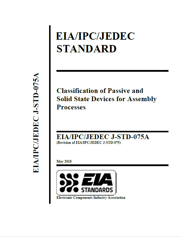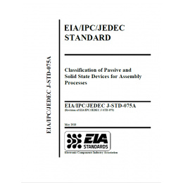 EIA/IPC/JEDEC J-STD-075 picks up where J-STD-020 left off by providing test methods to classify worst-case thermal process limitations for electronic components. Classification is referenced to common industry wave and reflow solder profiles including lead-free processing. The classifications represent maximum process sensitivity levels and do not establish rework conditions or recommended processes for an assembler. IPC JEDEC J-STD-075A outlines a process to classify and label non-semiconductor electronic component’s Process Sensitivity Level (PSL) and Moisture Sensitivity Level (MSL) consistent with the semiconductor industry’s classification levels (J-STD-020, Moisture/Reflow Sensitivity Classification for Nonhermetic Solid State Devices and J-STD-033, Handling, Packing, Shipping and Use of Moisture/Reflow Sensitive Surface Mount Devices). Developed by ECIA, IPC and JEDEC.