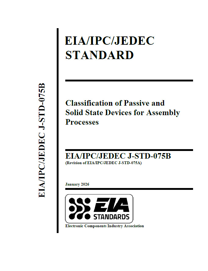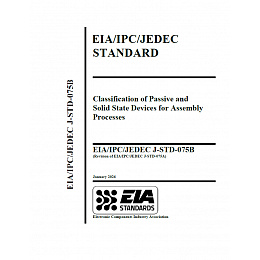 EIA/IPC/JEDEC J-STD-075 picks up where J-STD-020 left off by providing test methods to classify worst-case thermal process limitations for electronic components. Classification is referenced to common industry wave and reflow solder profiles including lead-free processing. The classifications represent maximum process sensitivity levels and do not establish rework conditions or recommended processes for an assembler. It outlines a process to classify and label non-semiconductor electronic component’s Process Sensitivity Level (PSL) and Moisture Sensitivity Level (MSL) consistent with the semiconductor industry’s classification levels (J-STD-020, Moisture/Reflow Sensitivity Classification for Nonhermetic Solid State Devices and J-STD-033, Handling, Packing, Shipping and Use of Moisture/Reflow Sensitive Surface Mount Devices). Developed by ECIA, IPC and JEDEC.