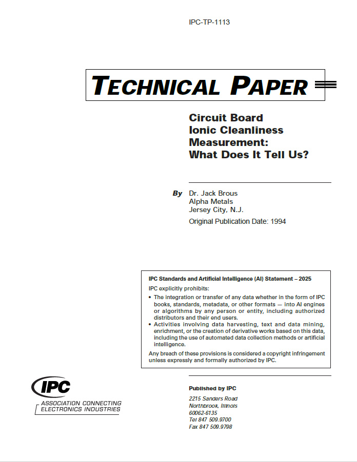 A Technical Paper by Dr. Jack Brous discussing ionic cleanliness measurement, testing methods and cleanliness standards in relation to product reliability. Also includes a brief discussion of no-clean fluxes. 8 pages. Released 1994
