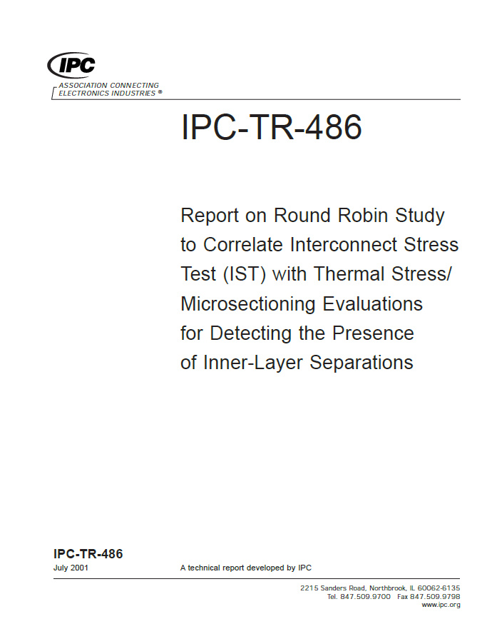This technical report provides full detail of the round robin study charged with assessing the use of Interconnect Stress Test (IST) as a test for incoming inspection in lieu of Thermal Stress in the detection of innerlayer separations in plated-through holes. Includes background on the Post Separation Task Group, test results, round robin test plan, conclusions and test methods used. 56 pages. Released July 2001.