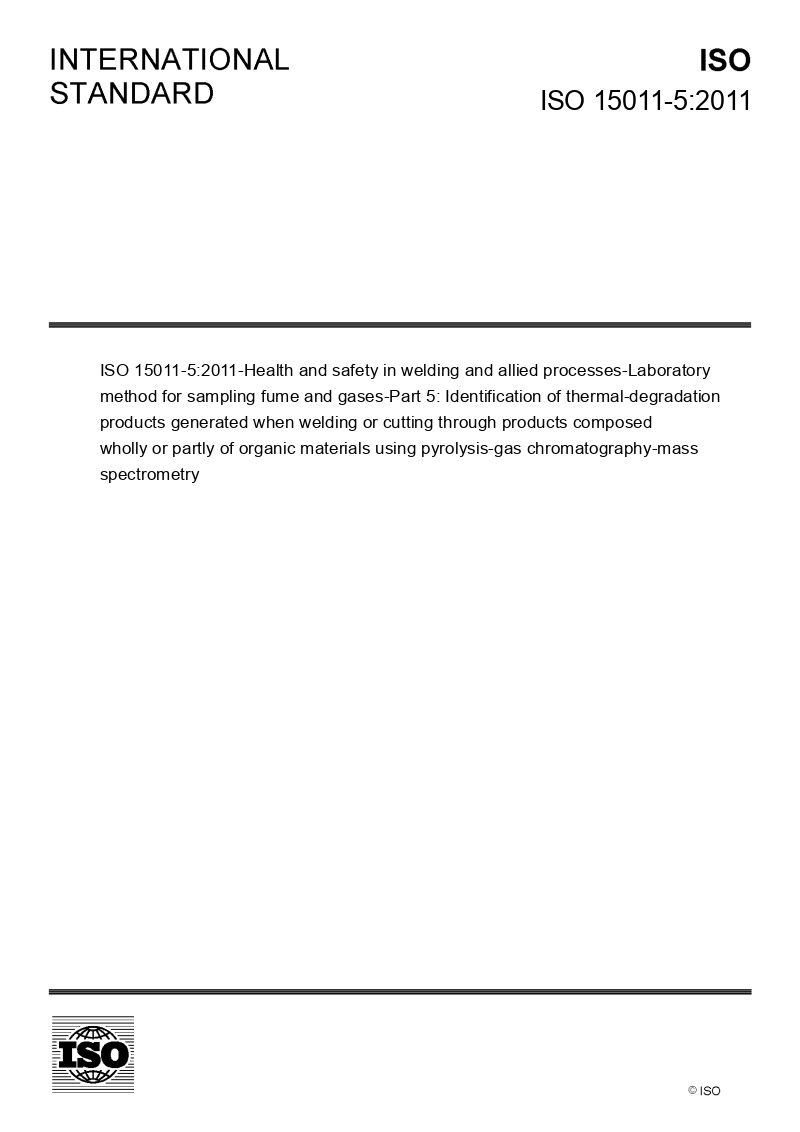 ISO 15011-5:2011-Health and safety in welding and allied processes — Laboratory method for sampling fume and gases — Part 5: Identification of thermal-degradation products generated when welding or cutting through products composed wholly or partly of organic materials using pyrolysis-gas chromatography-mass spectrometry