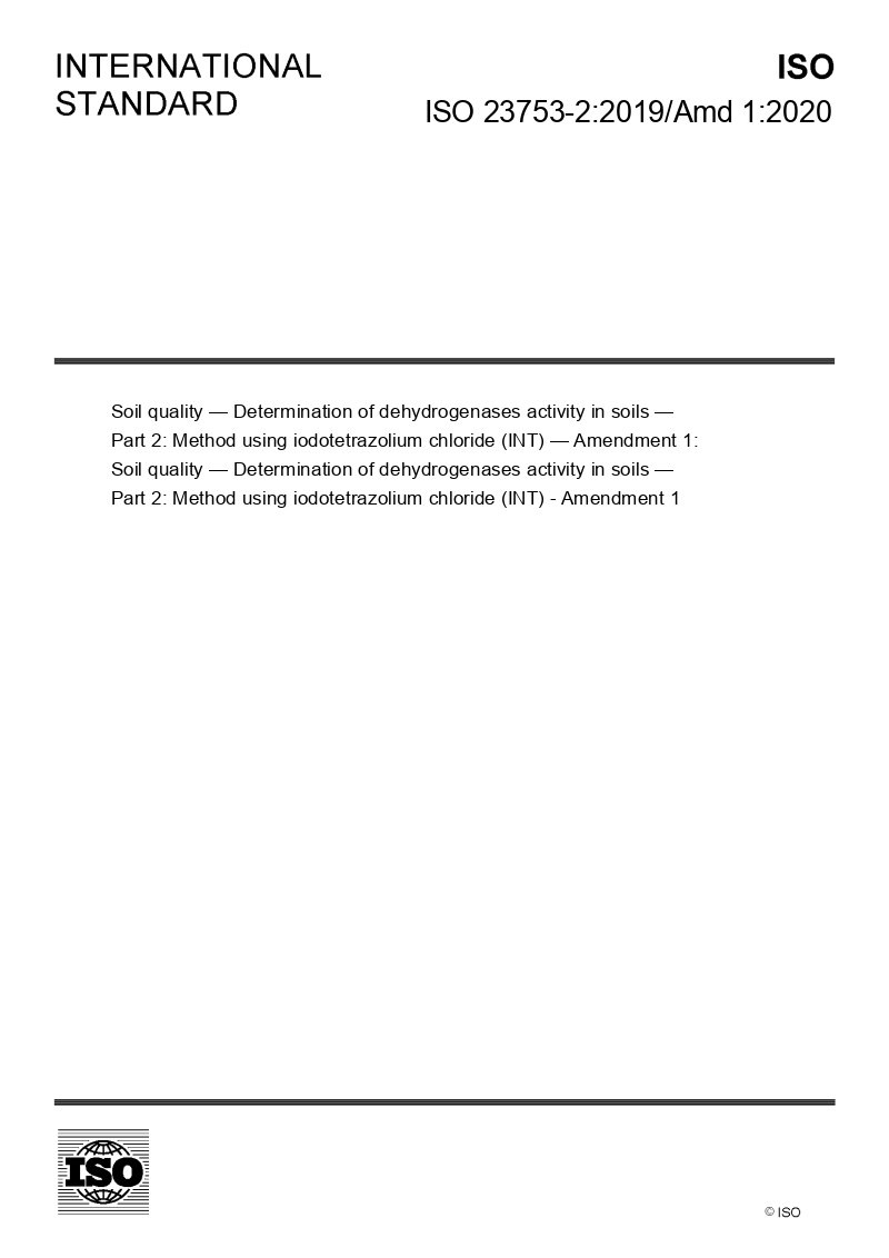 >ISO 23753-2:2019/Amd 1:2020-Soil quality — Determination of dehydrogenases activity in soils — Part 2: Method using iodotetrazolium chloride (INT) — Amendment 1