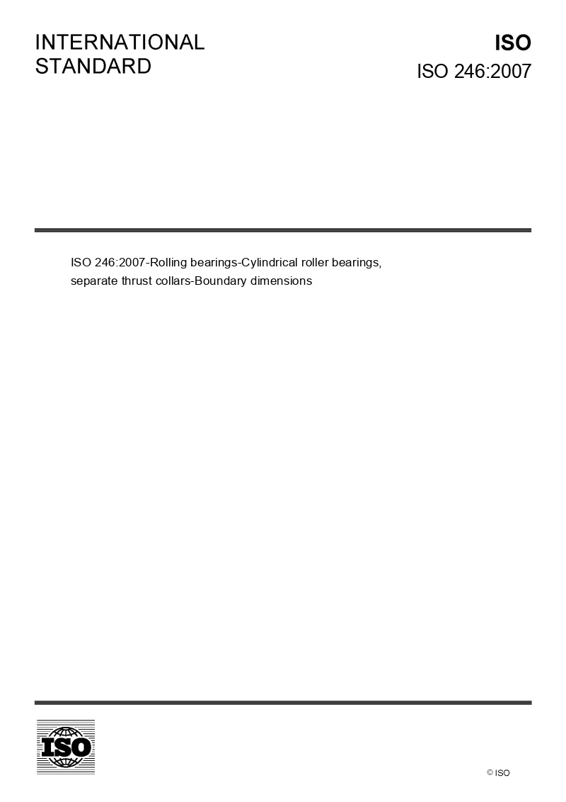 ISO 246:2007 specifies the width, the maximum outside diameter, the bore and the bore minimum chamfer of separate thrust collars for cylindrical roller bearings in diameter series 0, 2, 3, and 4 as specified in ISO 15. Dimensions for overall width and other geometrical features are not specified as they are dependent on the internal design of the bearings.