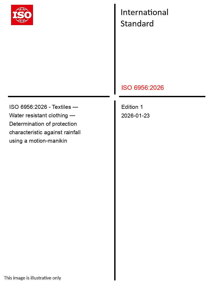 ISO 6956:2026 - Textiles — Water resistant clothing — Determination of protection characteristic against rainfall using a motion-manikin