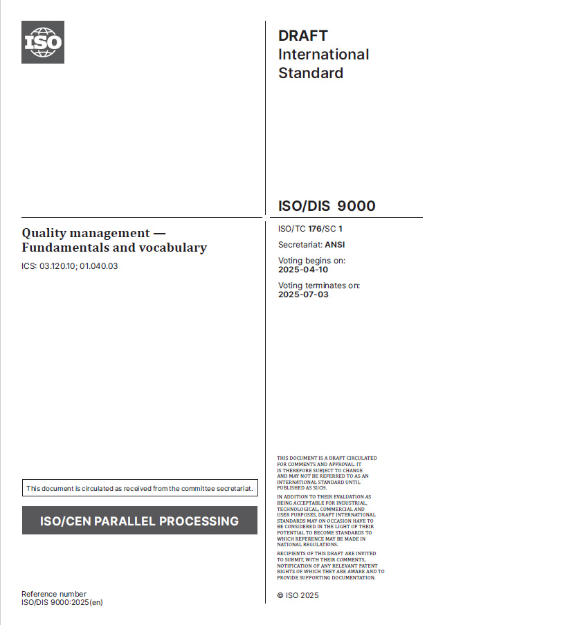 ISO/DIS 9000 Tento dokument poskytuje základní pojmy, principy a terminologii pro management kvality a poskytuje základ pro normy managementu kvality a systémů managementu kvality (QMS). Tento dokument má uživateli pomoci porozumět základním pojmům, principům a terminologii managementu kvality, aby mohl efektivně a účinně implementovat QMS a realizovat hodnotu z norem managementu kvality a QMS.