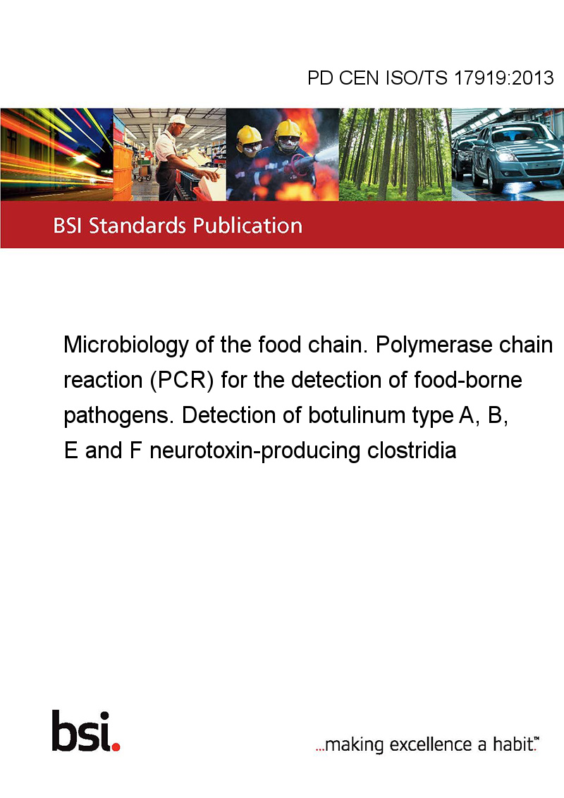 This standard PD CEN ISO/TS 17919:2013 Microbiology of the food chain. Polymerase chain reaction (PCR) for the detection of food-borne pathogens. Detection of botulinum type A, B, E and F neurotoxin-producing clostridia is classified in these ICS categories: