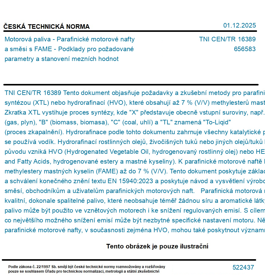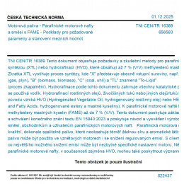 Tento dokument objasňuje požadavky a zkušební metody pro parafinické motorové nafty vyráběné syntézou (XTL) nebo hydrorafinací (HVO), které obsahují až 7 % (V/V) methylesterů mastných kyselin (FAME). Zkratka XTL vystihuje proces syntézy, kde "X" představuje obecně vstupní suroviny, např. "G" (gas, plyn), "B" (biomass, biomasa), "C" (coal, uhlí) a "TL" znamená "To-Liqid" (proces zkapalnění). Hydrorafinace podle tohto dokumentu zahrnuje všechny katalytické procesy, ve kterých se používá vodík. Hydrorafinací rostlinných olejů, živočišných tuků nebo jiných olejů/tuků biologického původu vzniká HVO (Hydrogenated Vegetable Oil, hydrogenovaný rostlinný olej) nebo HEFA (Hydroprocessed Esters and Fatty Acids, hydrogenované estery a mastné kyseliny). K parafinické motorové naftě lze přimíchávat methylestery mastných kyselin (FAME) až do 7 % (V/V). Tento dokument poskytuje základní informace k posouzení a schválení konečného znění textu EN 15940:2023 a poskytuje návod a vysvětlení výrobcům paliv, výrobcům směsí, obchodníkům a uživatelům parafinických motorových naft. Parafinická motorová nafta je velmi kvalitní, dokonale spalitelné palivo, které neobsahuje téměř žádnou síru a aromatické látky. Toto palivo může být použito ve vznětových motorech i ke snížení regulovaných emisí. S cílem dosáhnout co největšího možného snížení emisí může být nezbytné specifické nastavení motoru. Některé druhy parafinické motorové nafty, v současnosti zejména HVO, mohou také poskytnout významný příspěvek ke zvýšení obsahu složky nepocházející z ropy a/nebo obnovitelné složky v sortimentu paliv pro dopravu. Obecně pro provoz, dlouhou životnost a záruku vznětových motorů mohou parafinické motorové nafty vyžadovat validační krok pro potvrzení kompatibility paliva a vozidla, který je stále potřeba provést pro některé existující motory. Před použitím parafinické motorové nafty je zapotřebí konzultace s výrobcem vozidla.