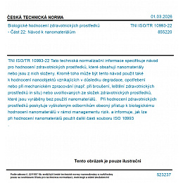 Tato technická normalizační informace specifikuje návod pro hodnocení zdravotnických prostředků, které obsahují nanomateriály nebo jsou z nich složeny. Kromě toho může být tento návod použit také k hodnocení nanoobjektů vznikajících v důsledku degradace, opotřebení nebo při mechanickém zpracování (např. při broušení, leštění zdravotnických prostředků in situ) nebo uvolňovaných ze složek zdravotnických prostředků, které jsou vyráběny bez použití nanomateriálů. Při hodnocení zdravotnických prostředků poskytuje vyškoleným odborníkům obecný přístup k biologickému hodnocení nanomateriálů v rámci managementu rizik. a informuje, jak lze při hodnocení nanomateriálů použít další části souboru ISO 10993.