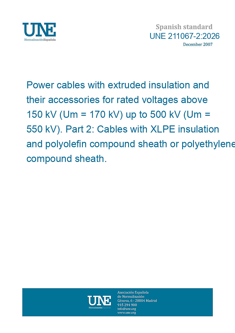 >UNE 211067-2:2026 - Power cables with extruded insulation and their accessories for rated voltages above 150 kV (Um = 170 kV) up to 500 kV (Um = 550 kV). Part 2: Cables with XLPE insulation and polyolefin compound sheath or polyethylene compound sheath.
