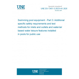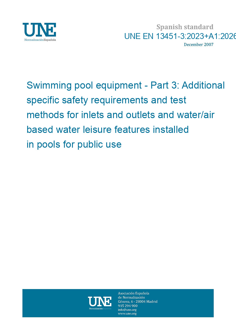Equipamiento para piscinas. Parte 3: Requisitos de seguridad y métodos de ensayo específicos adicionales para los dispositivos de entrada y salida de agua/aire y para los elementos de ocio acuático que utilicen agua/aire instalados en piscinas de uso público.