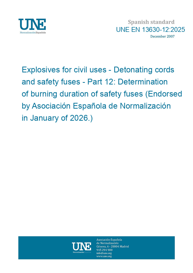 Explosives for civil uses - Detonating cords and safety fuses - Part 12: Determination of burning duration of safety fuses (Endorsed by Asociación Española de Normalización in January of 2026.)