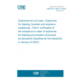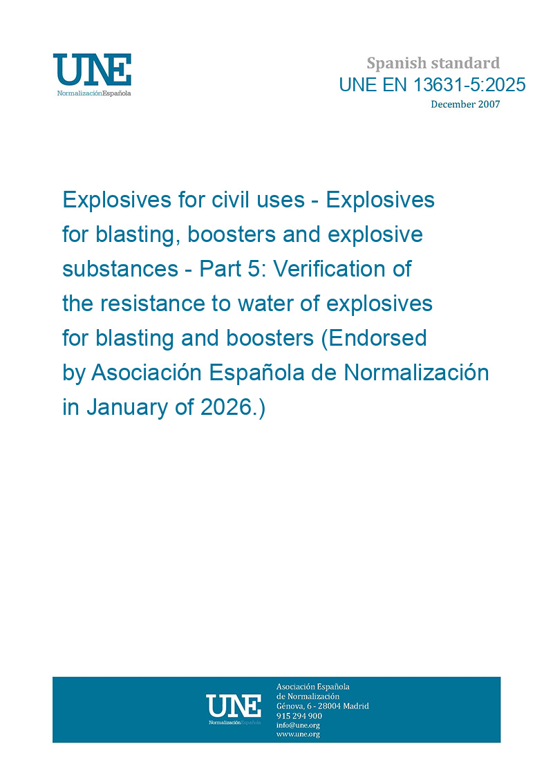 Explosives for civil uses - Explosives for blasting, boosters and explosive substances - Part 5: Verification of the resistance to water of explosives for blasting and boosters (Endorsed by Asociación Española de Normalización in January of 2026.)