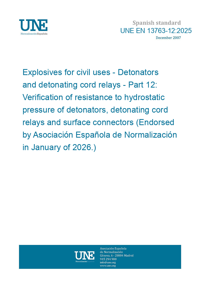 Explosivos para usos civiles. Detonadores y relés de cordón detonante. Parte 12: Verificación de la resistencia a la presión hidrostática de detonadores, relés de cordón detonante y conectores de superficie (Ratificada por la Asociación Española de Normalización en enero de 2026.)