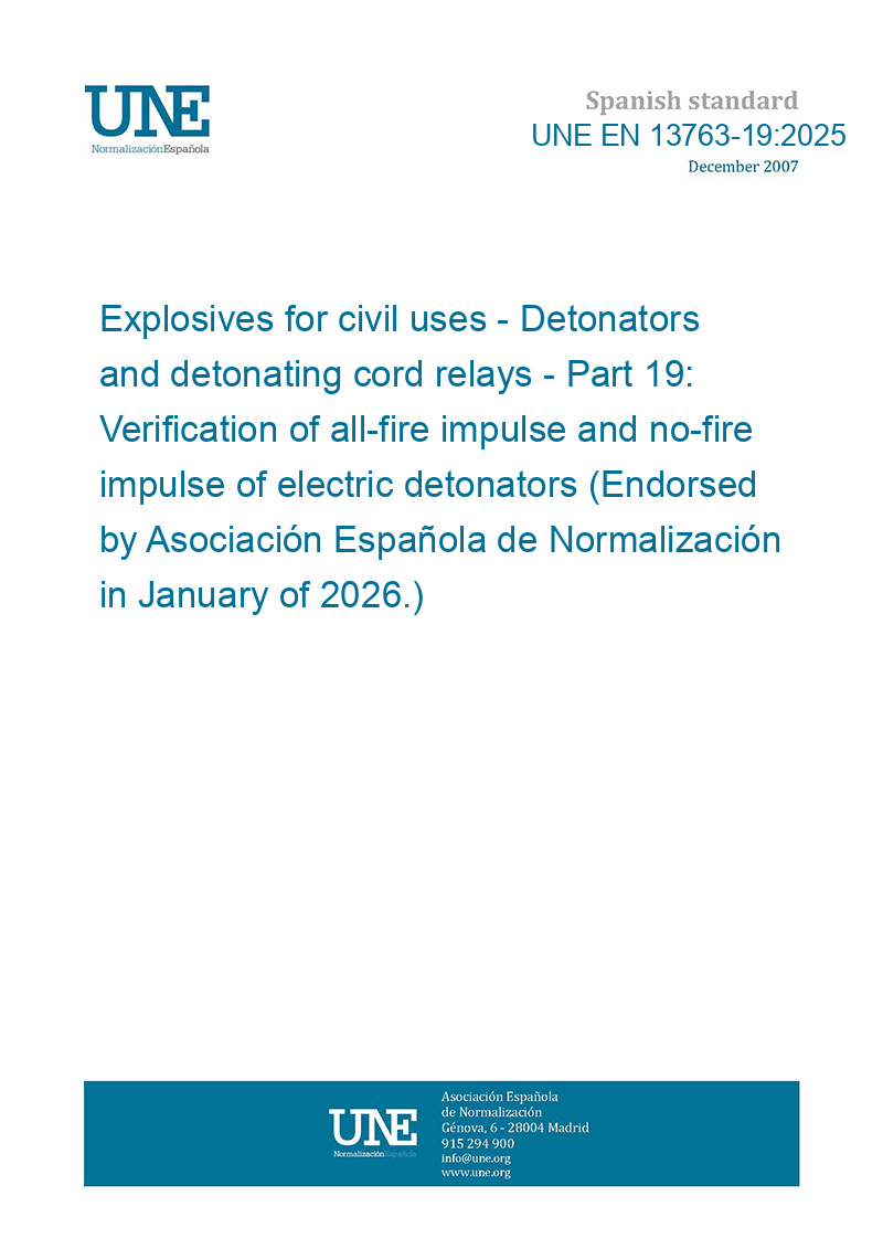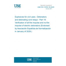 Explosivos para usos civiles. Detonadores y relés de cordón detonante. Parte 19: Verificación del impulso de encendido y del impulso de seguridad de detonadores eléctricos (Ratificada por la Asociación Española de Normalización en enero de 2026.)